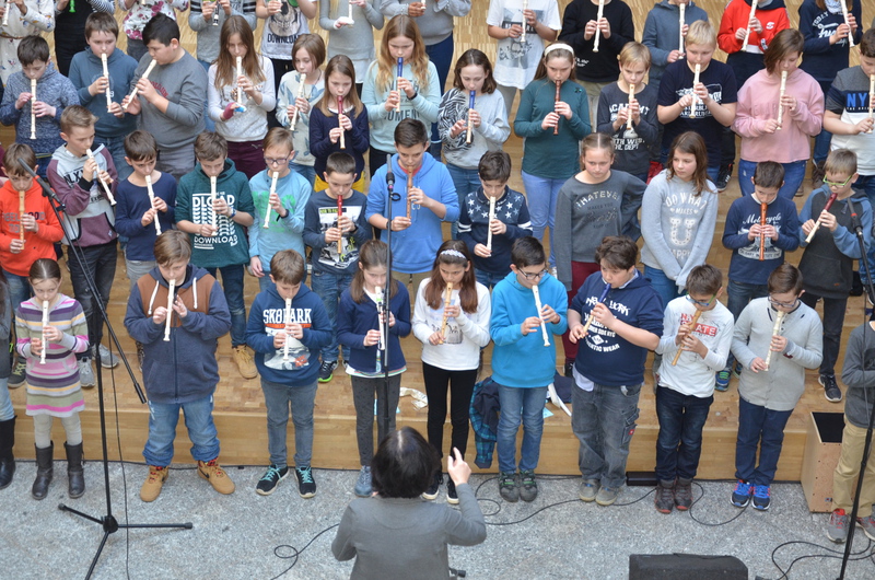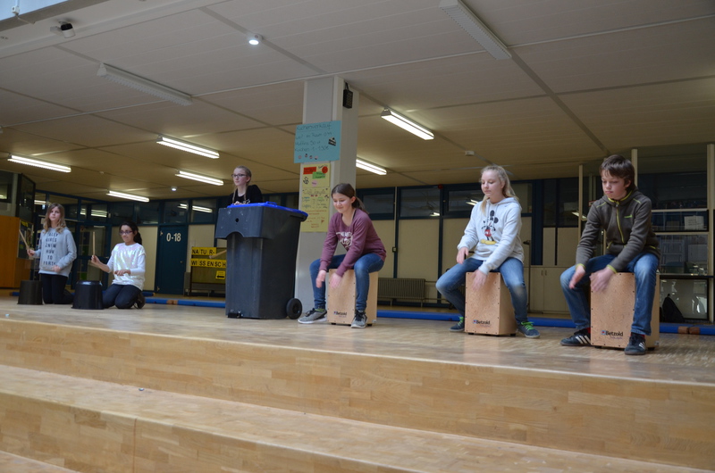 Im weiteren Verlauf des Nachmittags zeigte die Cajon-Ag unter Leitung von Hrn Geier (Musikschule Ettlingen) auf der Bühne im Foyer der Schule einen schlagkräftigen Vortrag. Die Klasse 5c mit