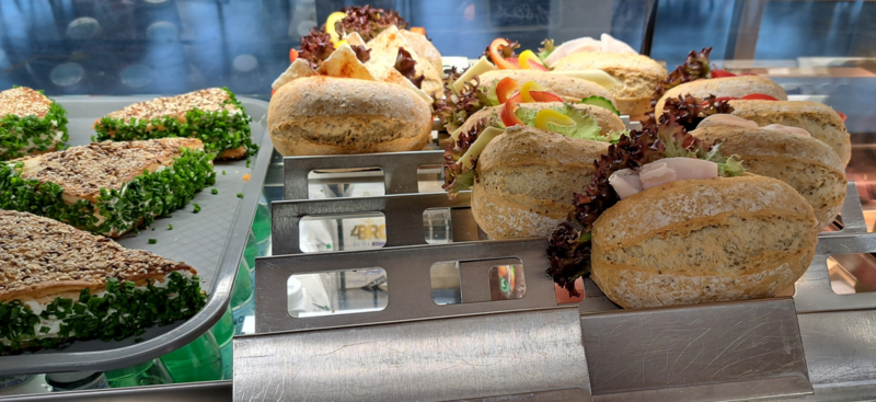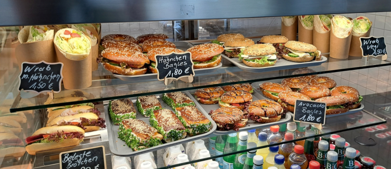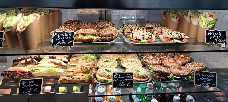 Weiter sind im Angebot täglich frisch belegte Beagles z.B mit Avocado oder Tomate-Mozzarella, natürlich gibt es die Beagles auch mit Hähnchen belegt, auch Körnerecken mit Frischkäse dürfen nicht fehlen.