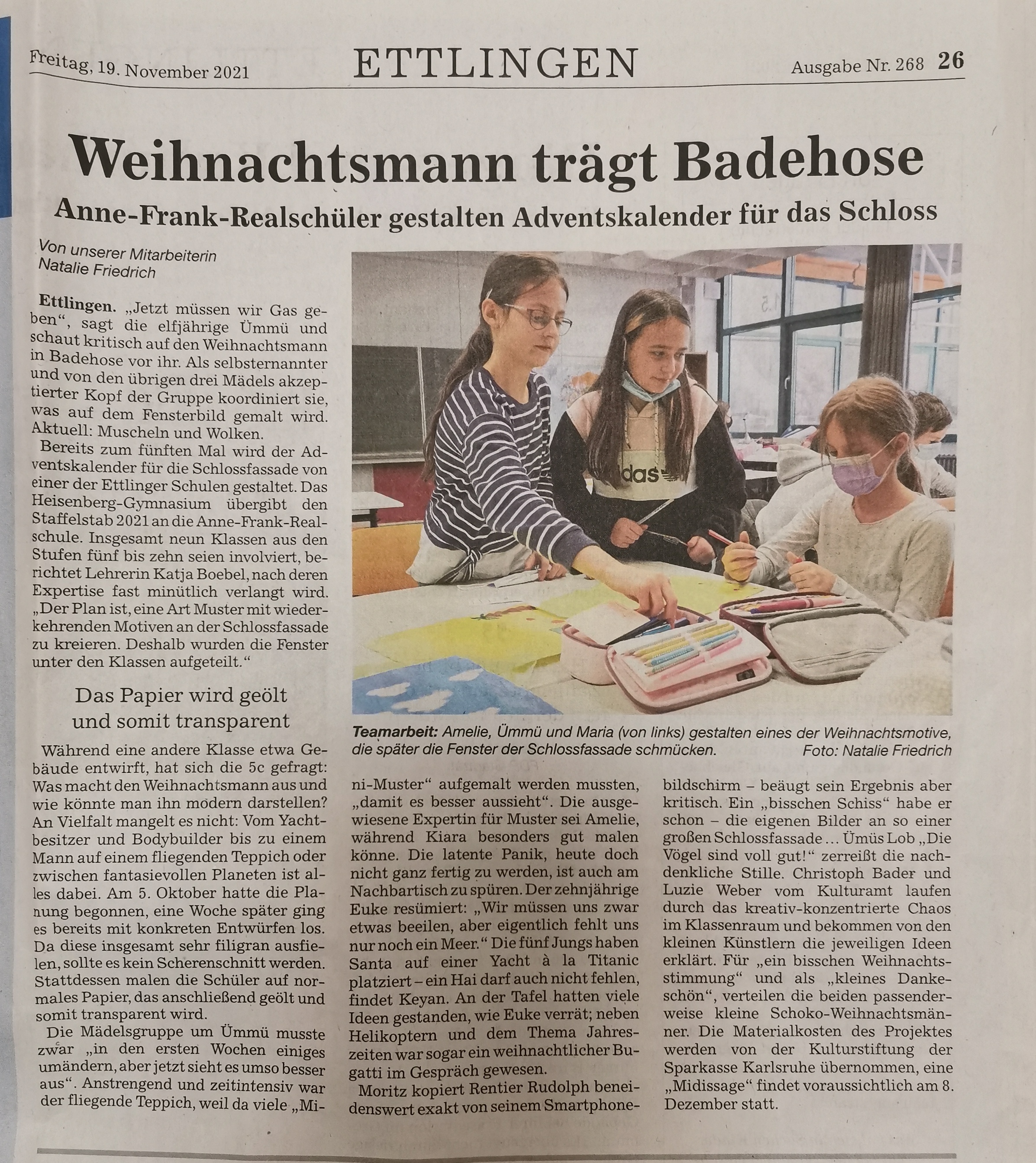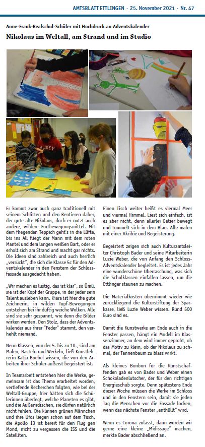 Auch im Ettlinger Amtsblatt am 25.11.2021 war ein Bericht über das Entstehen unserer Weihnachtsfenster abgedruckt: