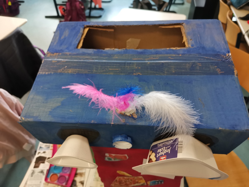 Der Preis für den Monat Juni geht an Mia, Jessy und Annika aus der Klasse 5c für ihren "Müllfresser". Diese Arbeit unterscheidet sich von vielen anderen dadurch, dass es sich um eine Pappskulptur handelt, die eine Luke besitzt, durch die tatsächlich Müll in das Wesen gelangen kann.
