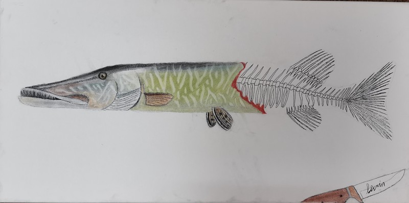 Levins Bild „Esox Lucius“ zeigt einen Hecht, der vorne von außen betrachtet sehr realistisch dargestellt wurde. Hinten sieht man nur die Gräten. Levin erzählt über sein Bild folgendes: „Durch die starke globale Überfischung wollte ich die eine Hälfte „tot“ darstellen und nur das Skelett des Fisches malen.“ Levin besuchte zu der Zeit, als er das Bild malte, übrigens einen Kurs für die Fischereischeinprüfung.
