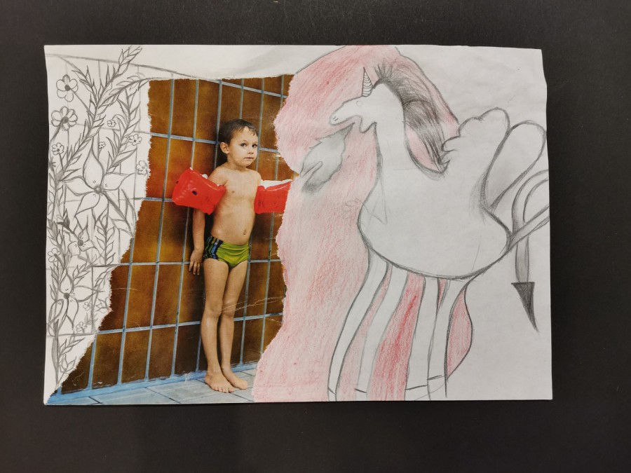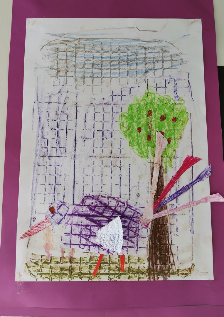 Der Preis für den Monat Februar geht an Mia Görke aus der Klasse 5c. Sie hat zum Thema "Fantasietiere" einen außergewöhnlichen Vogel erschaffen, dessen Federn sogar aus dem Bild rausragen. Wir finden eine tolle Idee! Mia hat dazu verschiedene Gegenstände durchgerieben und diese zu einem Federvieh zusammengestellt. So entstand eine bunte Frottage.