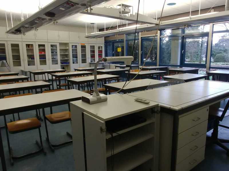 Neben einer klassischen Tafel finden sich auch ein Laptop, ein Visualizer und ein Beamer im Chemiesaal, auch der Internetzugang ist gewährleistet.