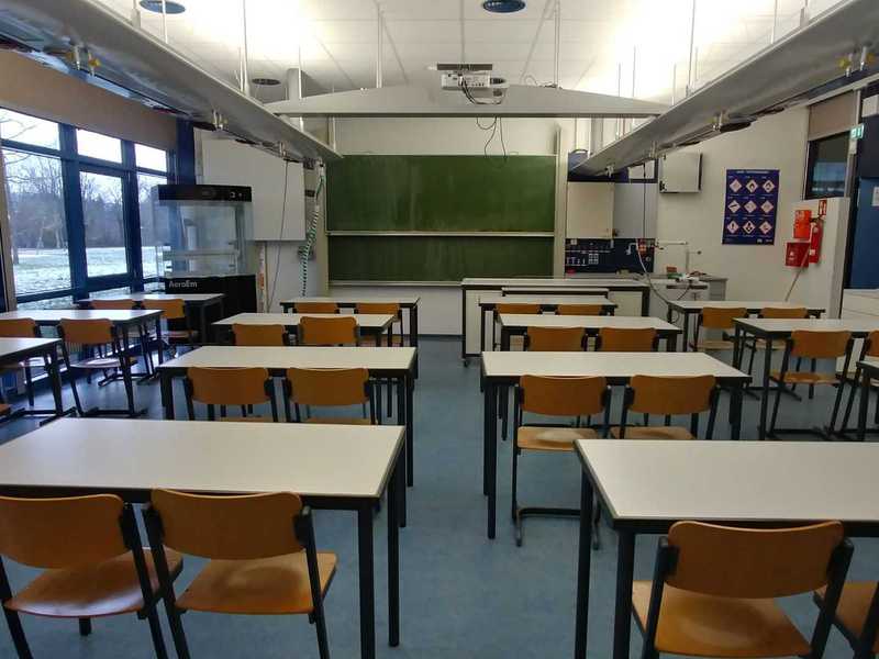 An der Anne- Frank- Realschule gibt es einen modern ausgestatteten Chemiesaal. Hier stehen den Schülerinnen und Schülern an den Tischgruppen Gas- und Stromanschlüsse zu Verfügung, die über ein Deckenversorgungssytem durch den Raum geführt werden. Dadurch ist ein praktisches Arbeiten in kleineren Gruppen (je vier Schüler) möglich. Alle Anschlüsse lassen sich zentral, vom Lehrerpult aus, steuern und im Notfall abschalten. Zur Ausstattung gehören selbstverständlich auch mehrere Waschbecken und die gängigen Sicherheitseinrichtungen. Der Chemiesaal verfügt des Weiteren über einen mobilen Abzug. In großzügig gestalteten Schränken werden Verbrauchsmaterialien und Geräte sowie zahlreiche Modelle und Schülerexperimentiersätze aufbewahrt, zu denen die Schülerinnen und Schüler beim Experimentieren nach Anweisung der Lehrkraft Zugang haben.